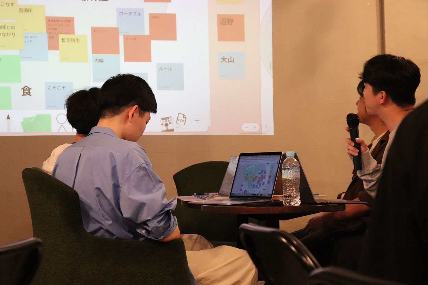 プログラムは各参加者による熱量の高い自己紹介からスタート。円形に座り、1人1分という短い時間の中で、それぞれの活動やバックグラウンドを紹介していきます。 コンペを通して地域と人をつなぐ新たな関係性を目指すプロジェクトやスマホで思い出を召喚できるステッカーの開発、さらには雑草を空に浮かせようと試みるメンバーも。テーマは多様でありながらも、どこか共通するバイブスをもった13のプロジェクトが集まりました。 みんなの活動が気になって仕方がない。そんな様子で互いの話に聞き入る参加者たち。同期生への興味や共感したポイントを書き込んだ「フェチカード」というカードを手に、はじめての交流が生まれました。