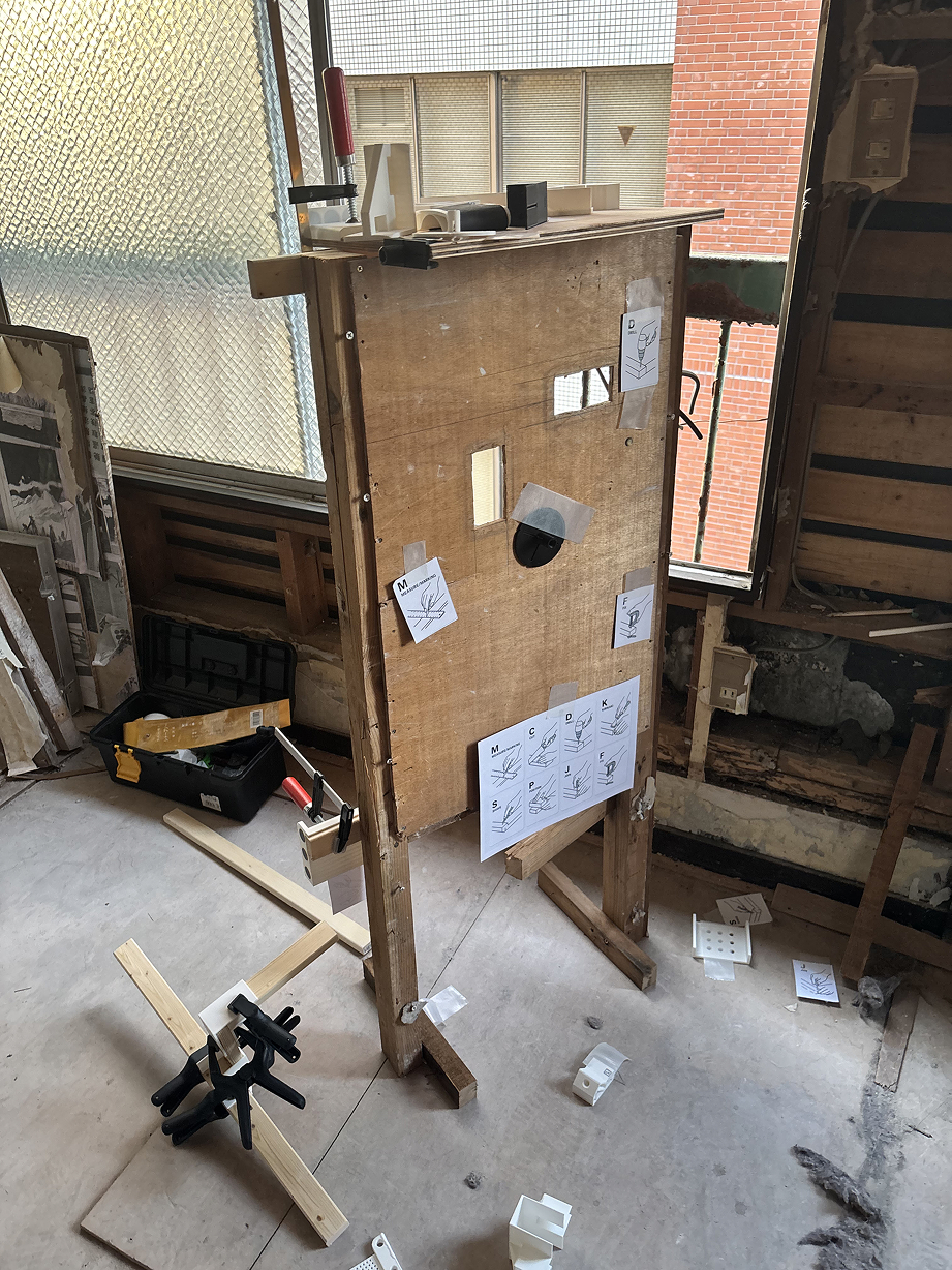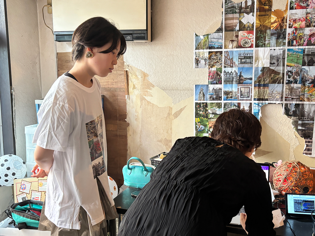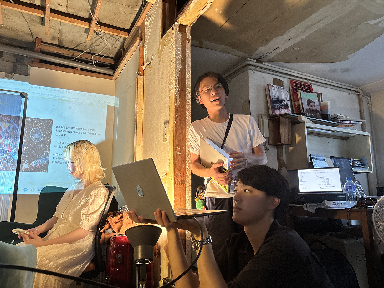 今回の会場は、ASIBAの新たな拠点となる「亀戸ガレージ」。 亀戸の下町エリアに位置し、今まさにメンバーの手によって改修が進められている築60年のビルです。至る箇所に残る古い痕跡と、徐々に導入されつつある最新の設備。過去と未来が交差する熱気あふれる空間に、3期生たち約30人が集まりました。 当日は早朝から、中には前日から会場入りして展示を準備した参加者も。 まだまだ発展途上の亀戸ガレージには、展示用のスペースも什器も用意されていません。 参加者たちは、あり合わせの素材や道具を駆使しながら、自らの手で展示空間を立ち上げていきました。