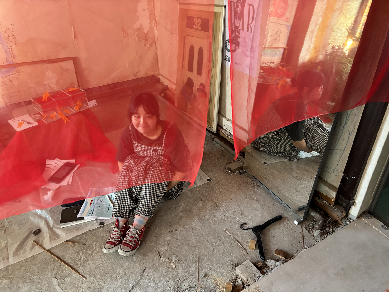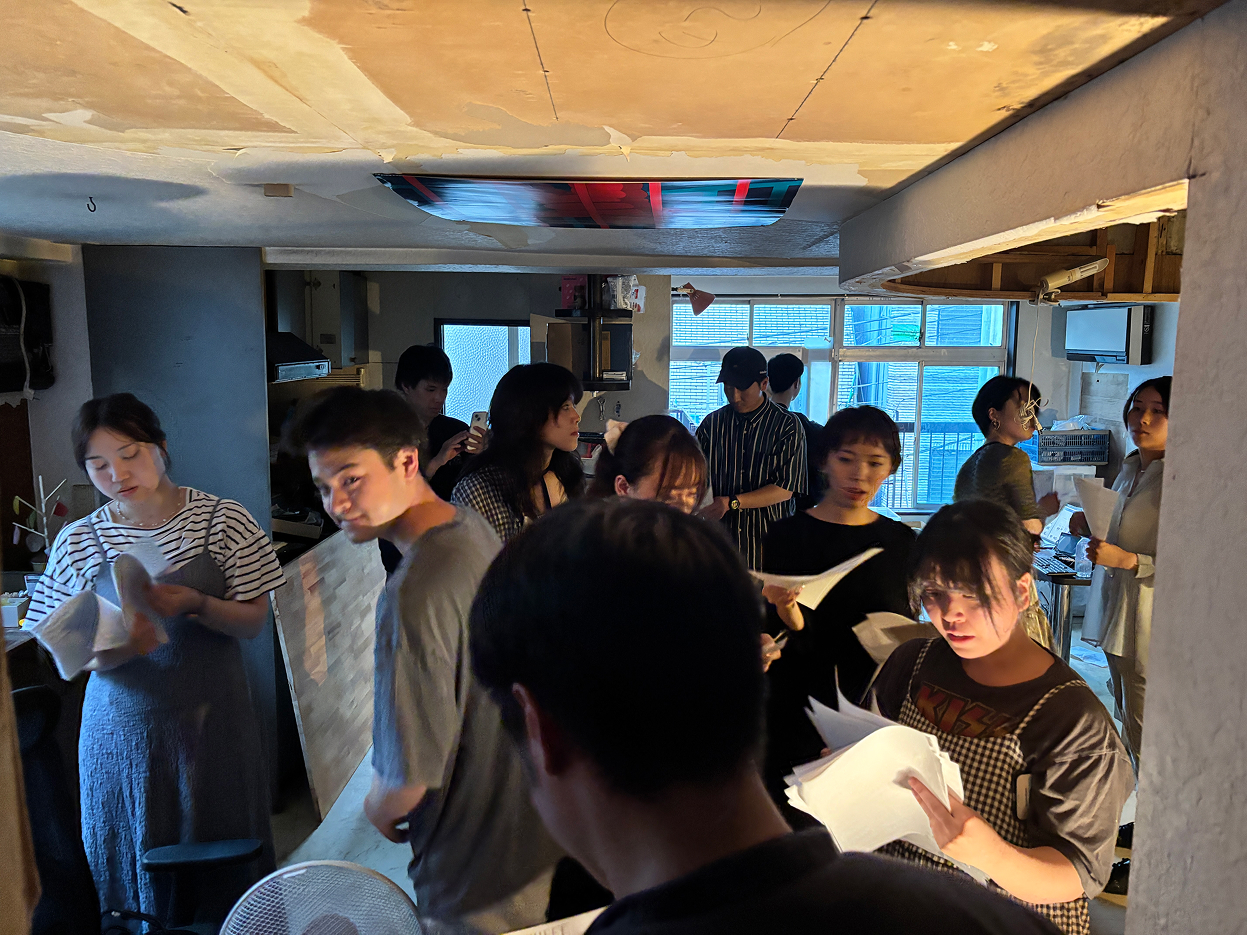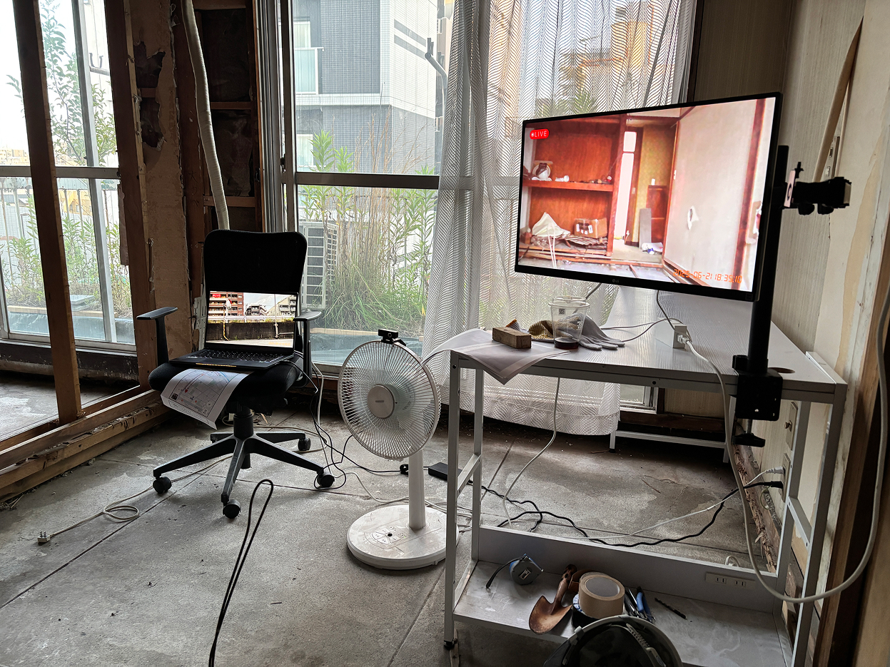 今回の会場は、ASIBAの新たな拠点となる「亀戸ガレージ」。 亀戸の下町エリアに位置し、今まさにメンバーの手によって改修が進められている築60年のビルです。至る箇所に残る古い痕跡と、徐々に導入されつつある最新の設備。過去と未来が交差する熱気あふれる空間に、3期生たち約30人が集まりました。 当日は早朝から、中には前日から会場入りして展示を準備した参加者も。 まだまだ発展途上の亀戸ガレージには、展示用のスペースも什器も用意されていません。 参加者たちは、あり合わせの素材や道具を駆使しながら、自らの手で展示空間を立ち上げていきました。